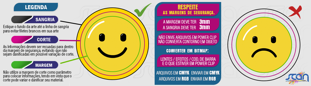 Como enviar a sangria e margem do meu arquivo? Arquivo DEVE ser enviado com 3mm de margem e 3mm de sangria. |