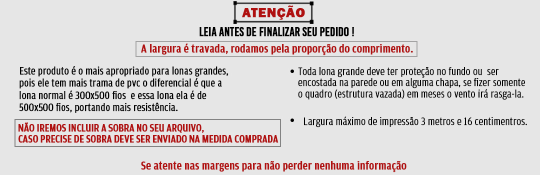 Lona Reforçada 510g (1000x1000 fios): Máxima resistência e brilho intenso. Impressão solvente em grandes formatos (até 316cm). Ideal para painéis e fachadas duráveis. Produção em 2 dias úteis! Qualidade superior para o seu projeto.